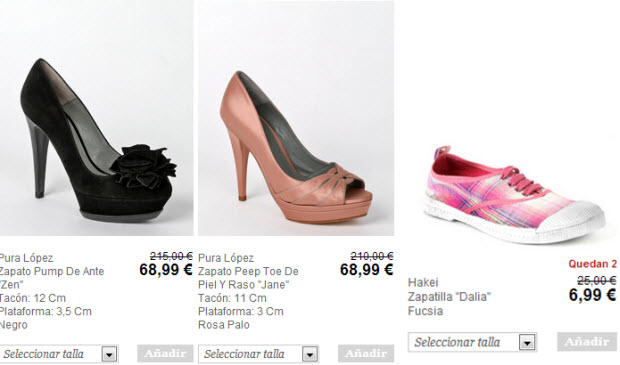Pero lo que más me ha llamado la atención son los sorprendentes precios del calzado en una venta muy completa de ropa elegante online con zapatos variados y de calidad. A continuación os pongo una muestra de esto que os he comentado:
