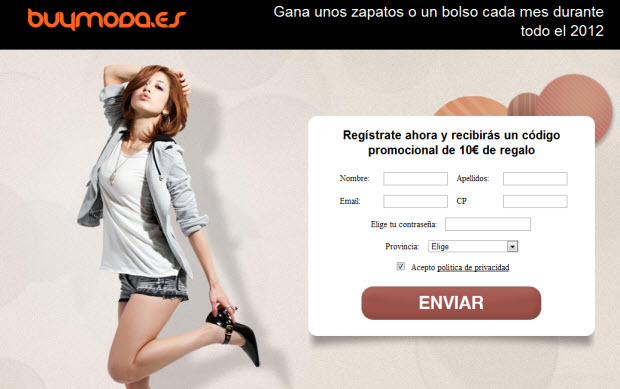 Y es que esta promoción no se limite únicamente al vale descuento de Buymoda, sino que sólo por apuntarte entras en el sorteo mensual de un bolso y unos zapatos de primeras marcas, por lo que es un aspecto también a tener en cuenta, ya que el registro es totalmente gratuito, nos dan 10 euros, y con suerte salimos con un bolso y zapatos, lo que no está nada mal para este tiempo en el que pocos sitios regalan algo en internet.